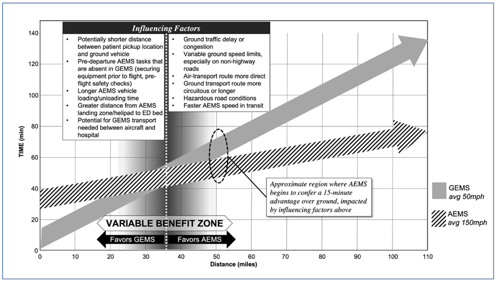 Source: John W. Lyng , Sabina Braithwaite , Heidi Abraham , Christine M. Brent , David A. Meurer , Alexander Torres , Peter V. Bui , Douglas J. Floccare , Andrew N. Hogan , Justin Fairless & Ashley Larrimore (2021) Appropriate Air Medical Services Utilization and Recommendations for Integration of Air Medical Services Resources into the EMS System of Care: A Joint Position Statement and Resource Document of NAEMSP, ACEP, and AMPA, Prehospital Emergency Care, 25:6, 854-873, DOI: 10.1080/10903127.2021.1967534