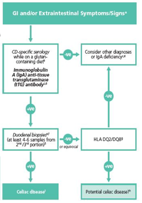 - Every 6 months until normalization of anti-TTG levels has occurred.