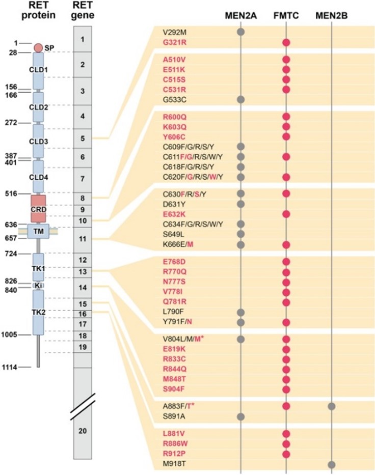 - Eng, C., Clayton, D., Schuffenecker, I., Lenoir, G., Cote, G., Gagel, R. F., van Amstel, H. K., Lips, C. J., Nishisho, I., Takai, S. I., Marsh, D. J., Robinson, B. G., Frank-Raue, K., Raue, F., Xue, F., Noll, W. W., Romei, C., Pacini, F., Fink, M., . . . et al. (1996). The relationship between specific RET proto-oncogene mutations and disease phenotype in multiple endocrine neoplasia type 2. International RET mutation consortium analysis. JAMA, 276(19), 1575-1579. https://www.ncbi.nlm.nih.gov/pubmed/8918855
