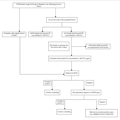 - Han, S., Xu, H., Zheng, J., Sun, J., Feng, X., Wang, Y., Ye, W., Ke, Q., Ren, Y., Yao, S., Zhang, S., Chen, J., Griggs, R. C., Zhao, Z., Qi, M., & Gatheridge, M. A. (2020). Population-Wide Duchenne Muscular Dystrophy Carrier Detection by CK and Molecular Testing. BioMed Research International, 2020, 8396429. https://doi.org/10.1155/2020/8396429