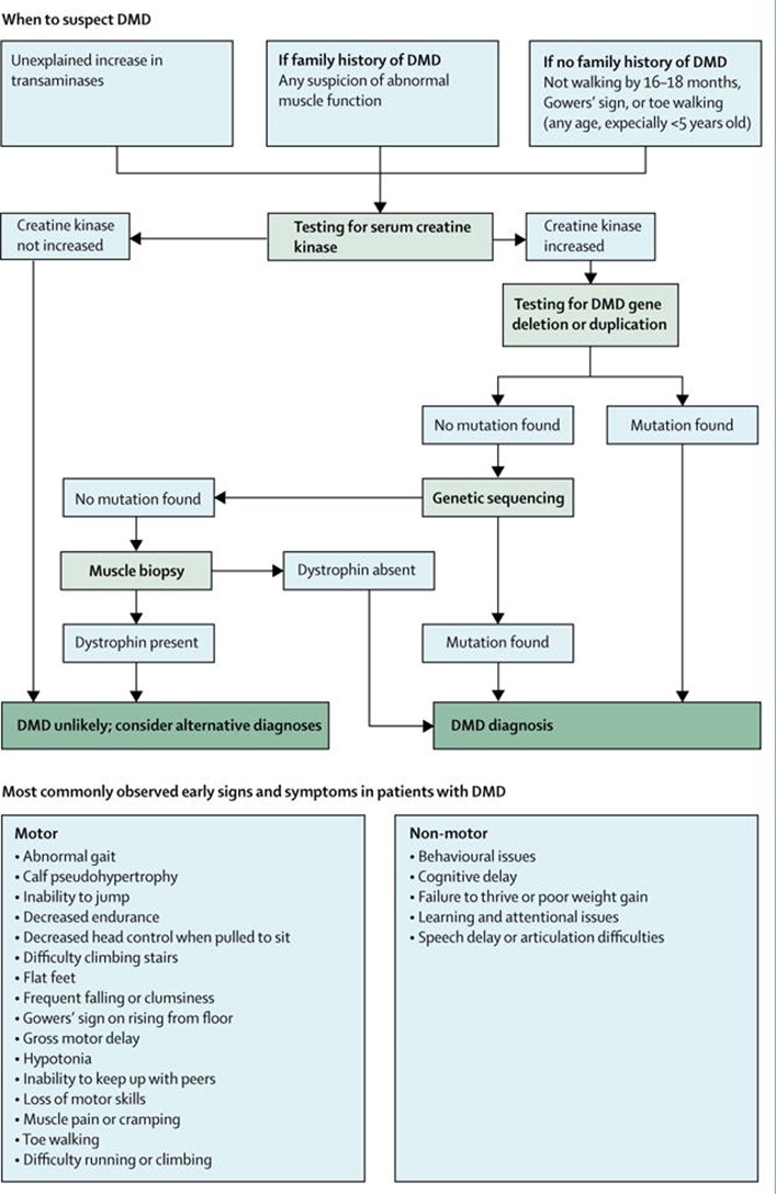 - Bushby, K., Finkel, R., Birnkrant, D. J., Case, L. E., Clemens, P. R., Cripe, L., Kaul, A., Kinnett, K., McDonald, C., Pandya, S., Poysky, J., Shapiro, F., Tomezsko, J., & Constantin, C. (2010). Diagnosis and management of Duchenne muscular dystrophy, part 1: diagnosis, and pharmacological and psychosocial management. Lancet Neurol, 9(1), 77-93. https://doi.org/10.1016/s1474-4422(09)70271-6