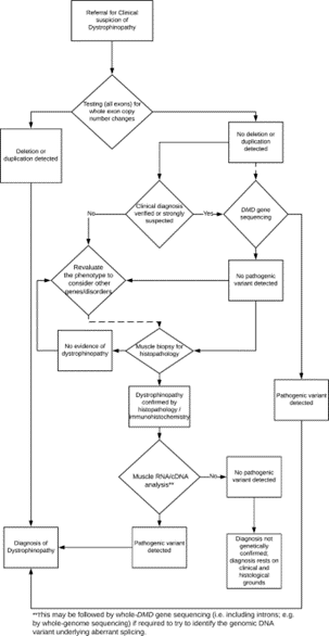 - Fratter, C., Dalgleish, R., Allen, S. K., Santos, R., Abbs, S., Tuffery-Giraud, S., & Ferlini, A. (2020). EMQN best practice guidelines for genetic testing in dystrophinopathies. European Journal of Human Genetics, 28(9), 1141-1159. https://doi.org/10.1038/s41431-020-0643-7