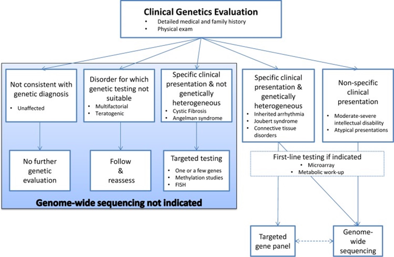 - When clinical presentation does not fit a well-described syndrome for which single-gene or targeted panel testing is available. If a specific diagnosis is suspected, molecular testing for the suggested disorder (with single-gene test or gene panel) should be the initial test.