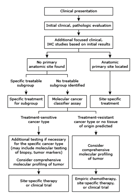 Hainsworth, et al. (2013) conducted a prospective trial testing the tumor biopsy specimens from previously untreated patients with CUP with a 92-gene reverse transcriptase polymerase chain reaction cancer classification assay. Molecular tumor profiling correctly identified tissue of origin in 85% of carcinomas of known primary origin. The study showed that molecular tumor profiling predicted a tissue of origin in 247 of 252 (98%) patients with CUP. The authors concluded that “molecular tumor profiling contributes to the management of patients with CUP and should be a part of their standard evaluation.”21
