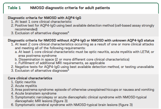 The International Panel on NMOSD recommends “testing with cell-based serum assays (microscopy or flow cytometry-based detection) whenever possible because they optimize autoantibody detection (mean sensitivity 76.7% in a pooled analysis; 0.1% false-positive rate in a MS clinic cohort).” They state that ELISA and indirect immunofluorescence assays have lower sensitivity and “strongly” recommend “interpretative caution if such assays are used and when low-titer positive ELISA results are detected in individuals who present with NMOSD clinical symptoms less commonly associated with AQP4-IgG (e.g., presentations other than recurrent optic neuritis, myelitis with LETM, or area postrema syndrome) or in situations where clinical evidence suggests a viable alternate diagnosis. Confirmatory testing is recommended, ideally using 1 or more different AQP4-IgG assay techniques. Cell-based assay has the best current sensitivity and specificity and samples may need to be referred to a specialized laboratory.” The table below outlines the NMOSD diagnostic criteria for adult patients.39